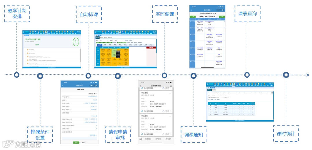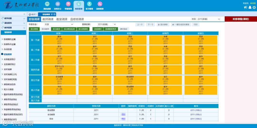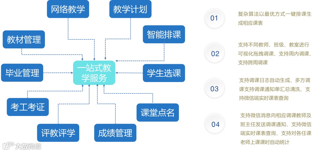 通过教学服务一体化,实现制定教学计划、智能排课、选课管理、成绩管理、毕业管理等功能,制定学生从入校到毕业的各个环节的安排,实现教学服务一体化的建设。