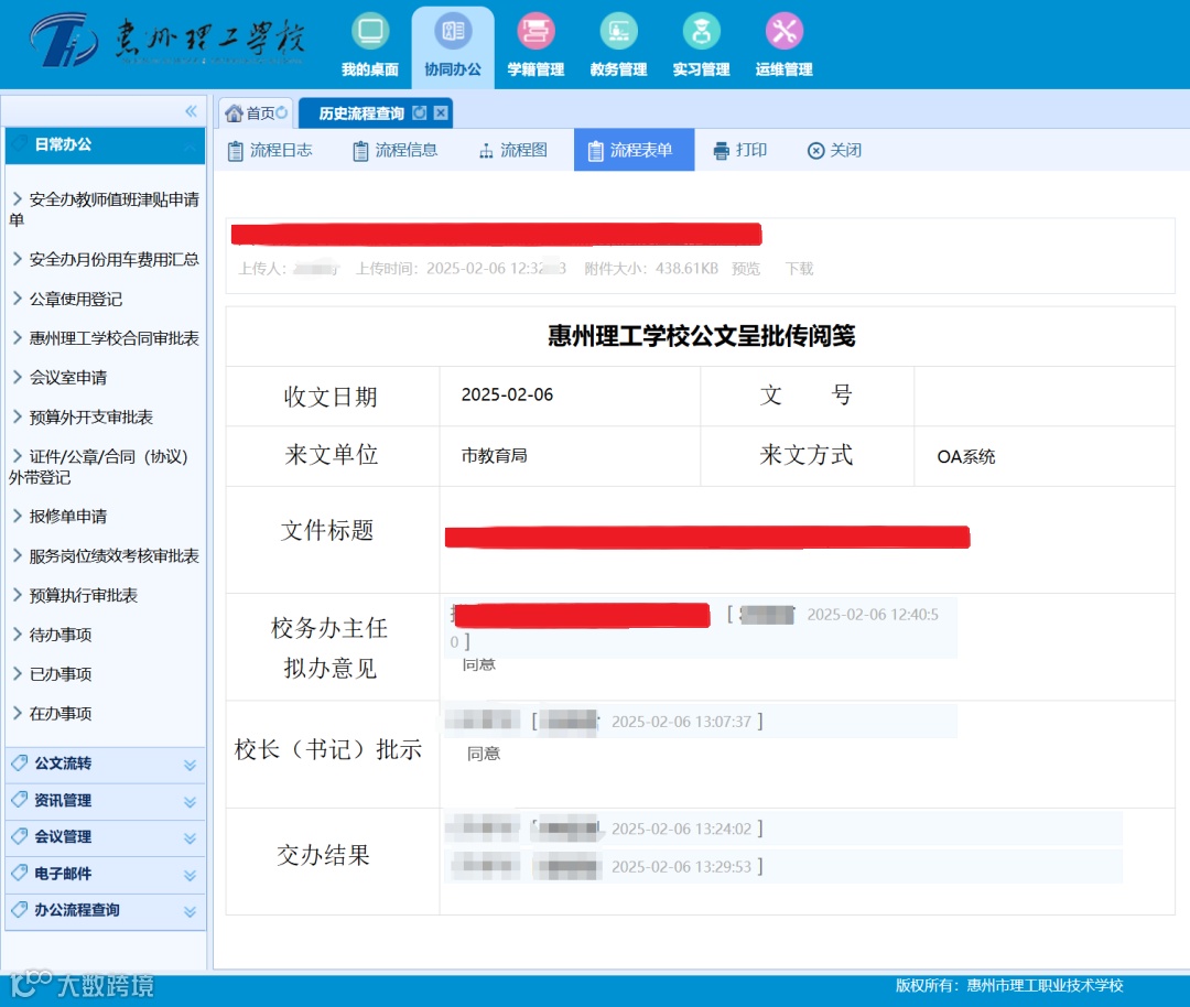 采用自主知识产权的工作流引擎,提供不需要二次开发的流程表单的可视化动态表配置、流程配置、为相关人员设置相应的工作办理权限;实现会议室申请、公务车派车登记申请表、安全办月份用车费用汇总审批、报修单、预算执行审批表、预算外开支审批表、服务岗位绩效考核审批表、安全办教师值班津贴申请单、值班车辆登记表审批表、学生开具证明、学生请假申请表、证件/公章/合同(协议)外带登记表、公章使用登记表、惠州理工学校合同审批表、惠州理工学校公文呈批传阅笺、学生报修单等请示审批类流程。能自动生成微信表单及微信办公流程。