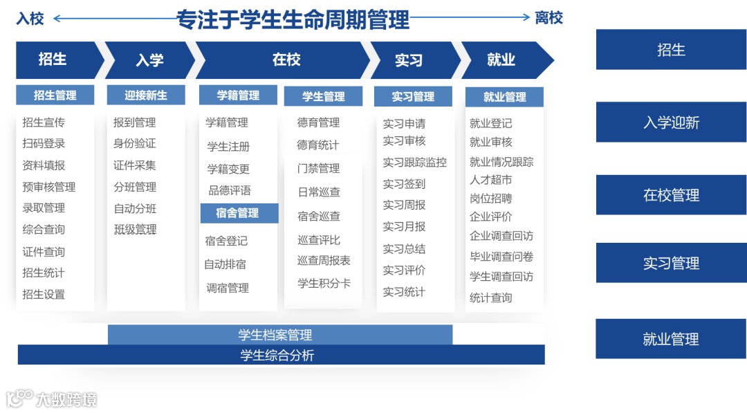 学生服务一体化是智慧校园核心系统之一,包含学生在入学前、入学时、在校期间、毕业以及离校后的全生命周期管理。提供灵活的业务配置功能,切合学校实际需求,整合学生管理相关部门之间的信息,规范数据一致性,以学生为本,提高学生管理工作效率。