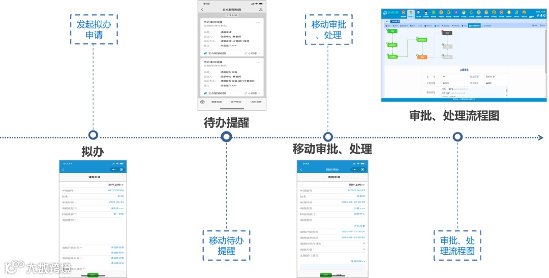 实现校务业务移动流程化,结合公司自主流程引擎实现公文、请假、报修、预算、考核、合同、公章、用车、学生请假等流程个性化审批、电子化办公服务;