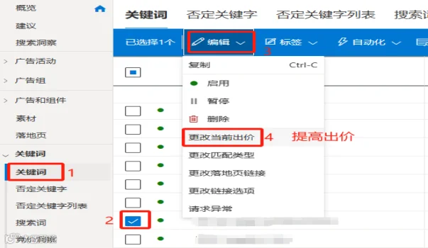 以下是提高出价来优化关键词的操作步骤: