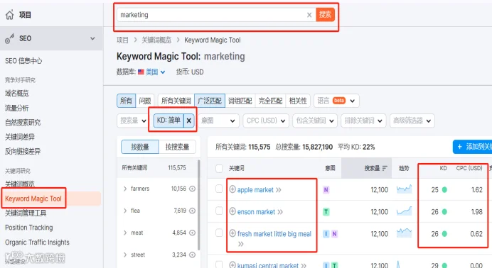 以下是Semrush工具获取关键词搜索量和竞争情况的操作步骤: