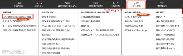 1.打开Bing Ads,在顶部菜单中,选择工具,然后选择关键字规划工具。
