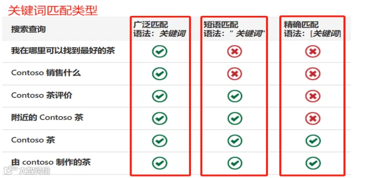 关键词匹配类型是指广告与用户搜索查询之间的匹配程度,包括广泛匹配、词组匹配和完全匹配。当展示量较少时,广告主应该调整关键词匹配类型。