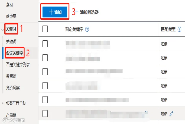 以下是添加否定关键词的操作步骤: