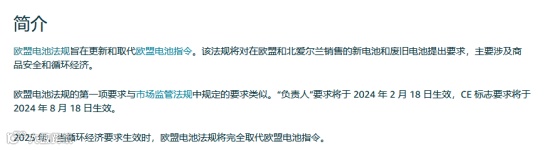特别提示:符合法规要求的电池必须在2024年2月18日之前向平台提交欧代信息;CE标志要求于2024年8月18日生效。