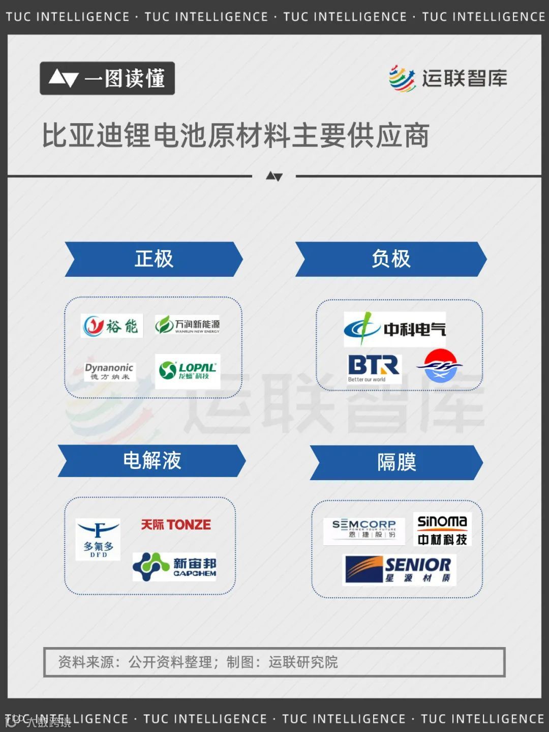 比亚迪锂电池的正极材料供应商主要是湖南裕能、湖北万润、龙蟠科技、德方纳米;负极材料供应商主要是中科电气、贝特瑞和翔丰华;隔膜供应商主要是恩捷股份、星源材质、中材科技;电解液的主要供应商包括多氟多、天际股份以及新宙邦。
