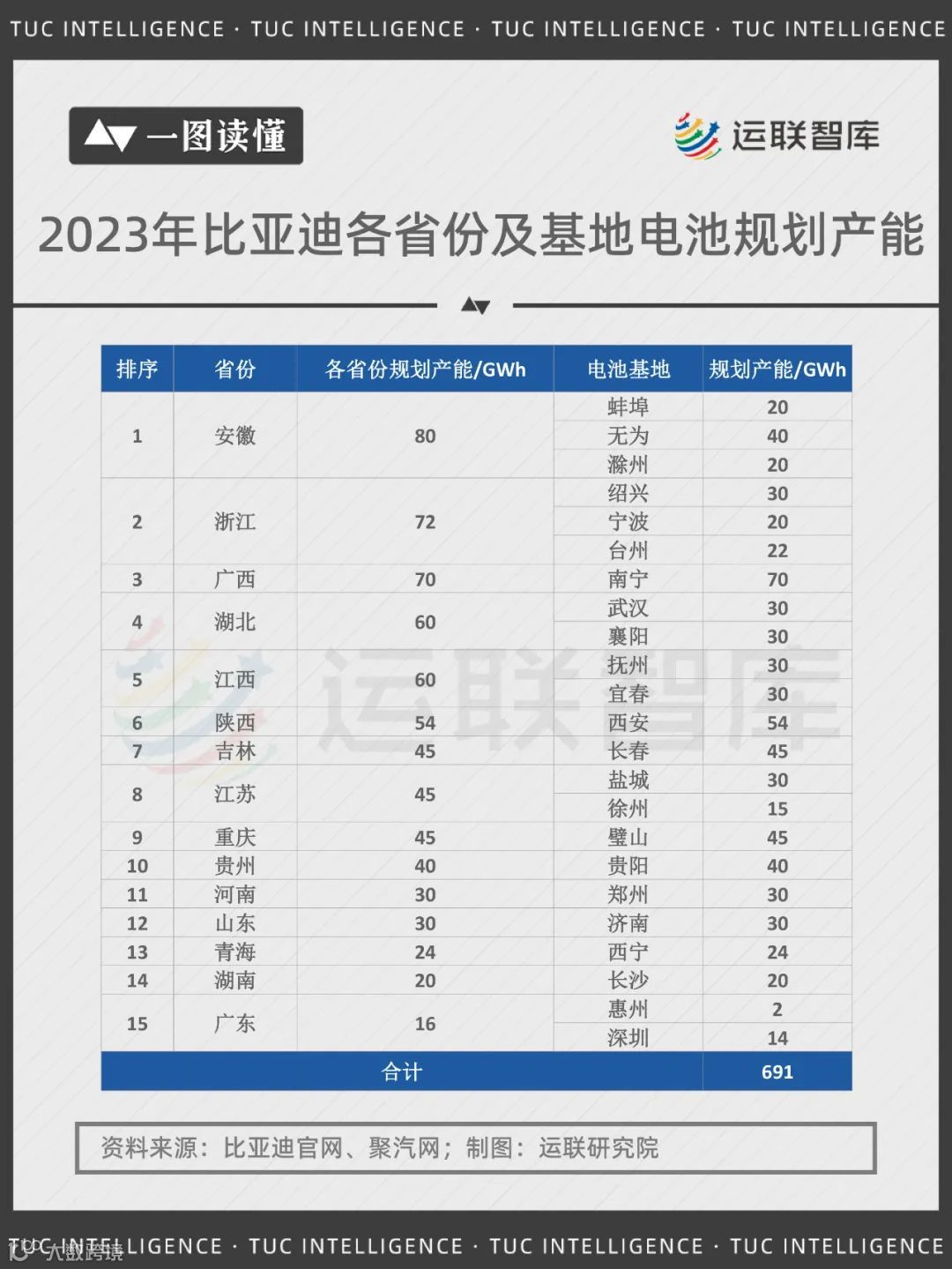 据公开数据,比亚迪2023年规划产能约691GWh。如果按每1GWh电池可装车2000辆、整车重量约2吨动力电池占整车重量的 30%来计算,预计比亚迪在 2023 年的动力电池总产量约为 82.92万吨。其中,正极、负极、电解液和隔膜的需求量将达到 33.168万吨、33.168万吨、12.43 万吨和 4.146万吨。