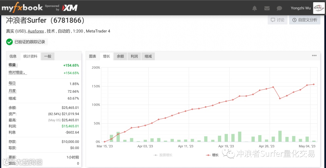 “前进号”冲浪者(Surfer)策略采用趋势型对冲模式,在多平台同步运行并经Myfxbook.com严格验证[k]。