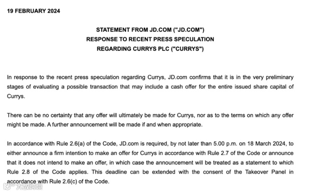 2023年11月,德国《经理人杂志》报道称,京东有兴趣收购德国最大的电子产品零售商Ceconomy。2024年2月,京东发布声明称,评估收购Currys仍处于“非常初步的阶段”,不排除对Currys已发行股本进行现金收购要约。