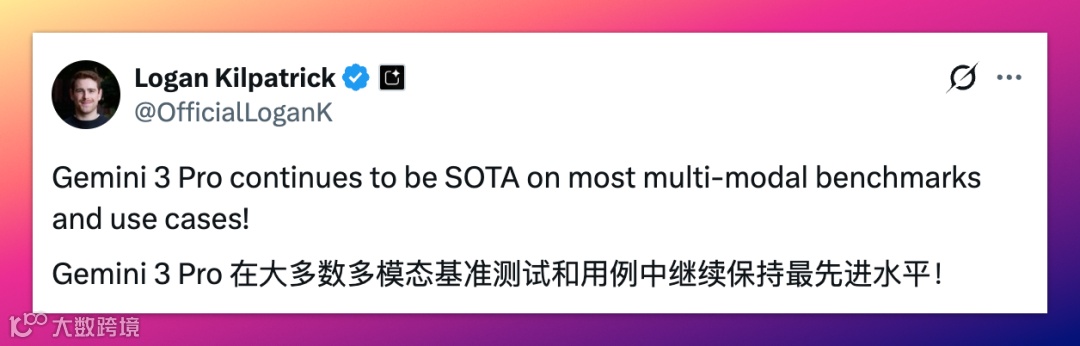 Gemini 3 Pro在多数多模态基准测试中保持领先,被AI Studio产品负责人Logan Kilpatrick称为“当前最强模型”。