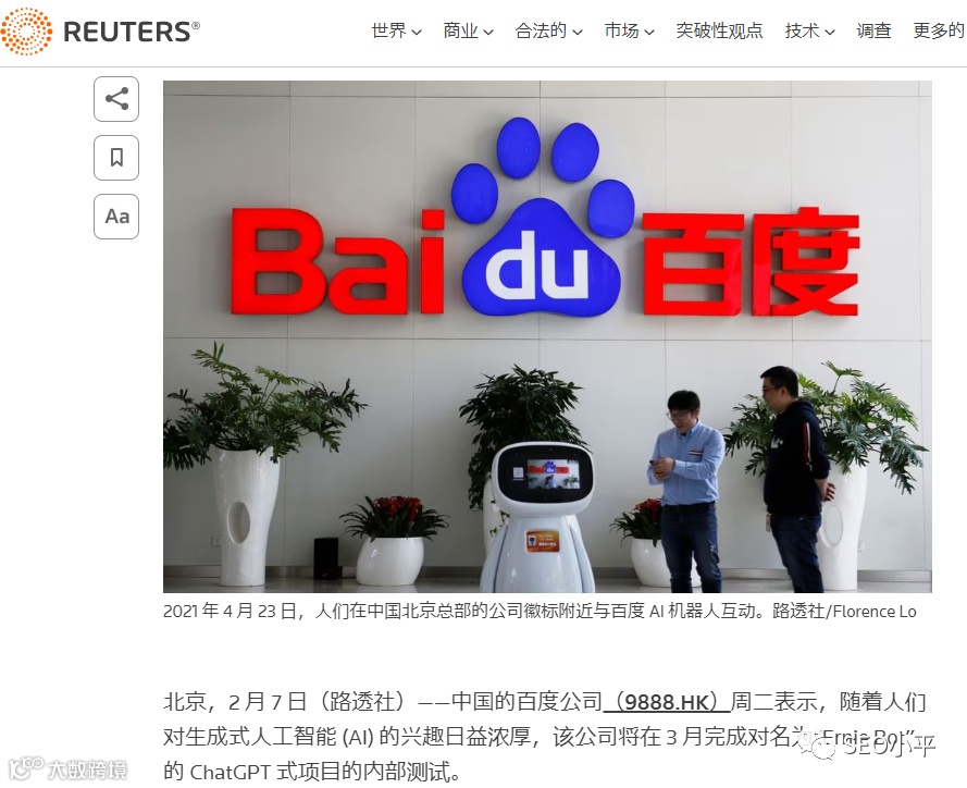 北京,2023年2 月 7 日(路透社)——中国的百度公司(9888.HK)周二表示,随着人们对生成式人工智能 (AI) 的兴趣日益浓厚,该公司将在 3 月完成对名为“Ernie Bot”的 ChatGPT 式项目的内部测试,该项目名字确定为“文心一言”。百度当天也确认了该消息。该消息推动搜索引擎巨头百度在香港上市的股票周二上涨 15.3%。同时,百度还表示,按照谷歌和微软节奏,文心一言开放内测还有可能提前。相关负责人表示,ChatGPT相关技术,百度都有。百度在人工智能四层架构中,有全栈布局。包括底层的芯片、深度学习框架、大模型以及最上层的搜索等应用。文心一言,位于模型层。百度在人工智能领域深耕数十年,拥有产业级知识增强文心大模型ERNIE ,具备跨模态、跨语言的深度语义理解与生成能力。