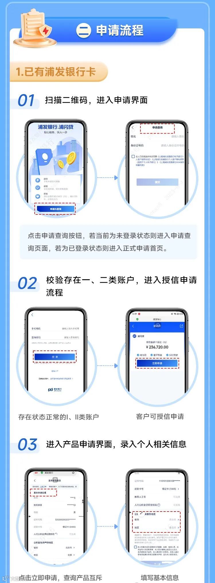 1、浦闪贷申请资料:身份证,商业银行一类卡,(线下提额:户口本,收入证明,流水,用途凭证)。有浦发一类卡准备一类卡,没有的开二类户。