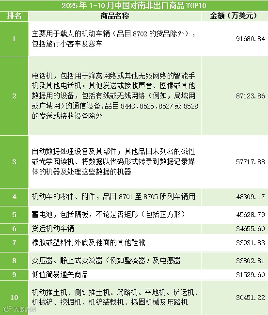 电子产品与数字基建主导:电话机及通信设备(8.71亿美元) 与自动数据处理设备(5.77亿美元) 分列第二、三位。这表明南非作为非洲数字经济发展的高地,其消费者与企业对高端电子产品和数字解决方案的需求旺盛。蓄电池(4.56亿美元) 和变压器(3.38亿美元) 的出口,则呼应了南非在能源领域(包括可再生能源和电网)的投资与需求升级。