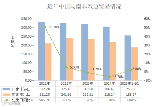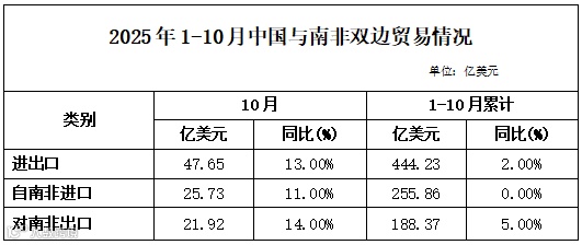 南非长期是中国在非洲的第一大贸易伙伴,其数百亿美元的贸易规模远超其他非洲国家。根据海关总署数据显示,2025年1-10月,中国与南非的双边贸易额达到444.23亿美元,同比增长2%。其中,10月单月双边贸易额47.65亿美元,同比增长13%,呈现加速增长态势。