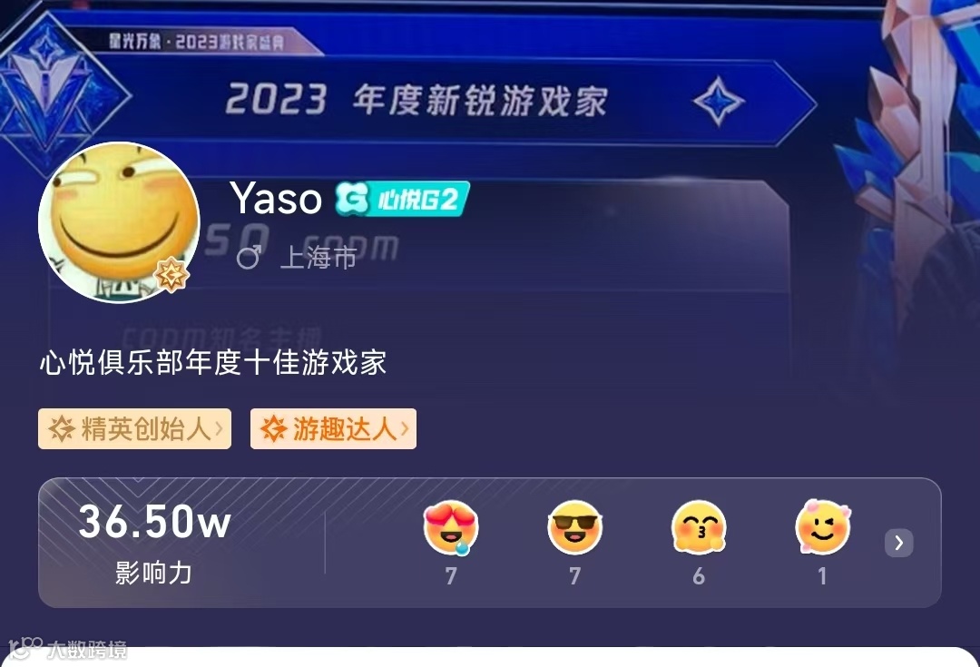 Yaso:对,这个“影响力系统”一上线我就发现了,但也没刻意去提升,平时在俱乐部活跃就有这么多了。这个表情贴纸看着很有意思,跟我头像很搭(笑),当然有这么高影响力也很开心,这也是我过去努力的认可之一吧。
