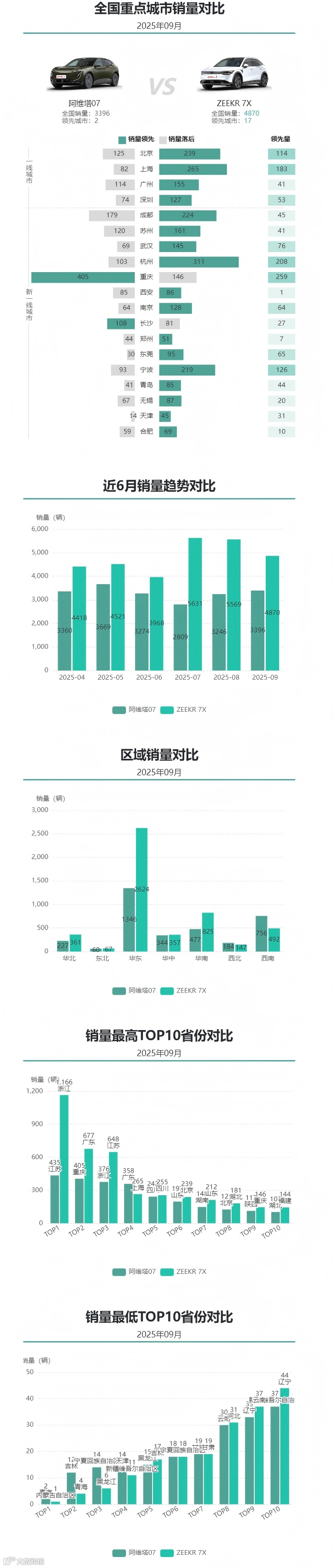 2025年9月,极氪7X卖了4870辆,而阿维塔07的销量要低一个量级。更关键的是城市覆盖,极氪7X在17个重点城市实现销量领先,而阿维塔07只在1个城市占优。