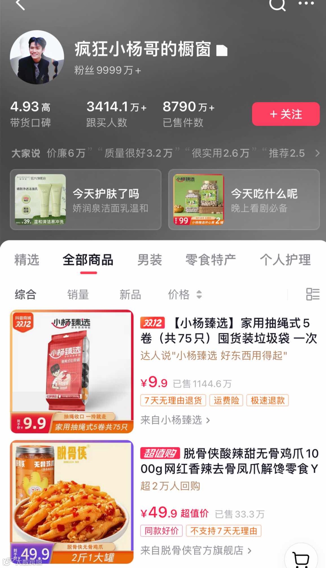 截至发稿,小杨哥的抖音商城橱窗显示,小杨臻选八黑沙琪玛已售2.5万;家用抽绳式垃圾袋已售1144.1万。