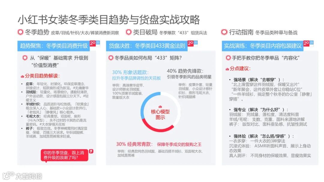 货盘规划需遵循 “433 黄金法则”,结合类目趋势与内容包装实现高效种草。30% 形象话题款拉升品牌调性,如高端皮草、设计师联名羽绒服;40% 趋势先锋款引领潮流,涵盖轻量羽绒服、小众设计针织衫、廓形大衣等;30% 经典常青款保障复购,包括纯色基础款羽绒服、百搭羊绒衫等。各品类趋势鲜明:皮草走向年轻化与时装化,环保材质与短款廓形受宠;羽绒服细分通勤、户外、设计感三大场景;羊绒针织主打 “软黄金” 品质与 “老钱风” 松弛感;毛呢大衣以双面呢、经典色系为流量密码;裤子聚焦显瘦、保暖、百搭三大核心功效。内容包装需突出强场景(解决 “去哪穿”)、强专业(讲解面料、版型优势)、强体验(穿搭示范、真人测评),让产品卖点更易被用户感知。