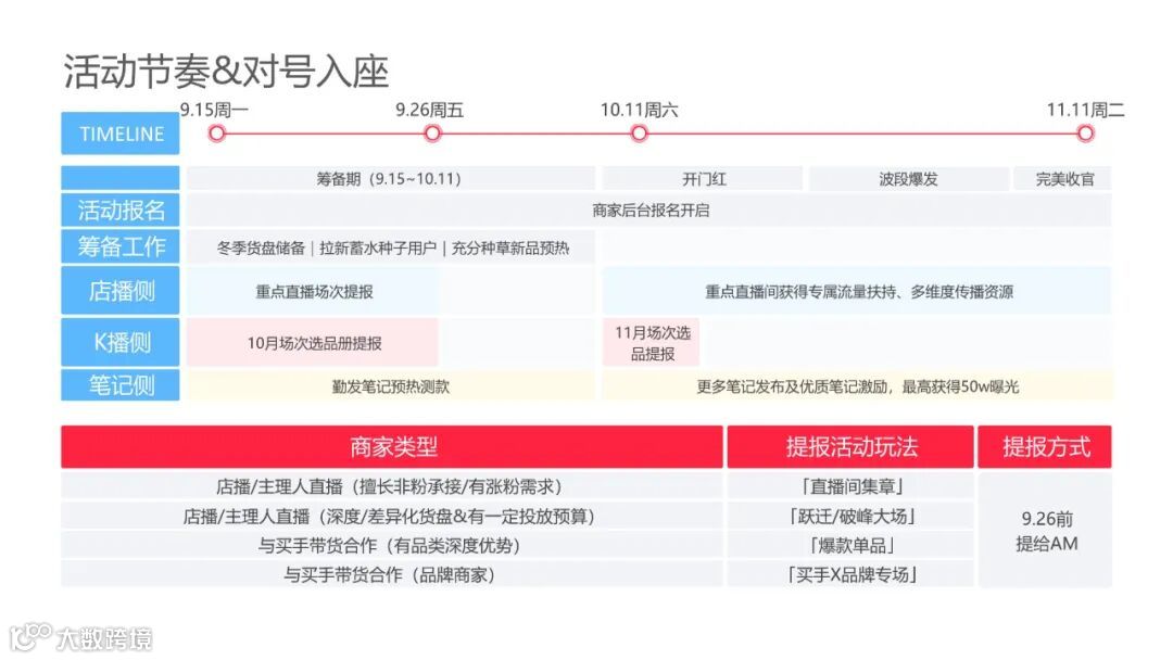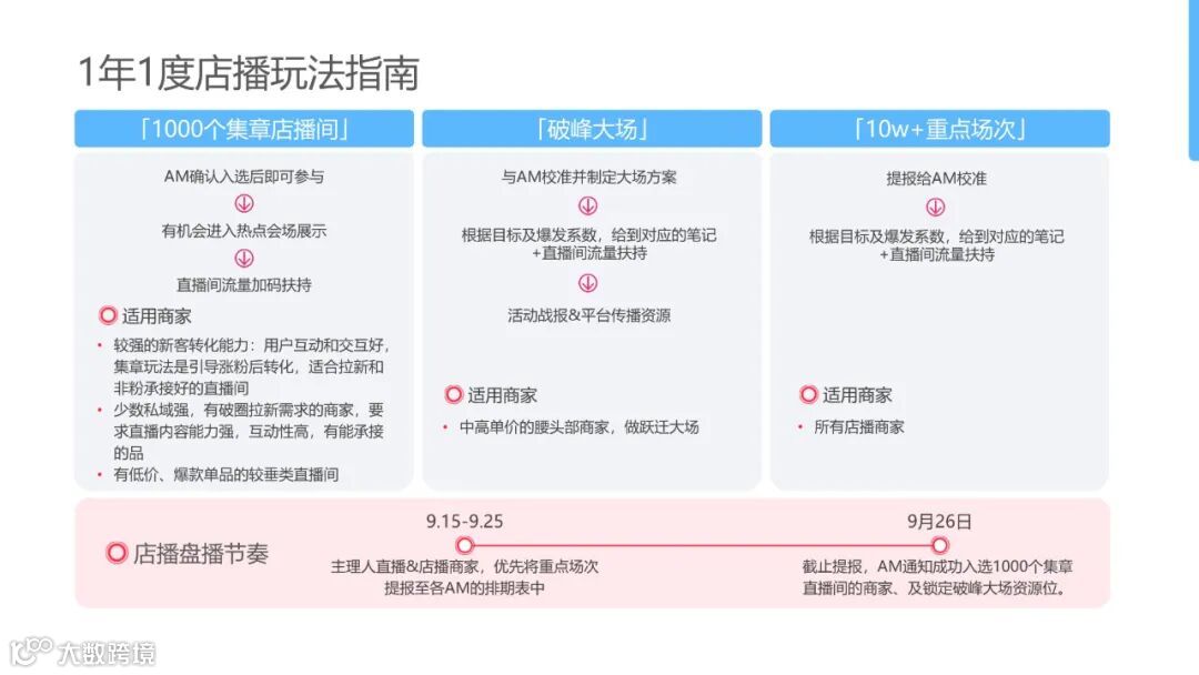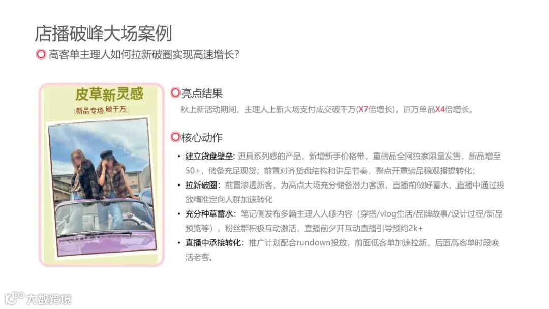 活动节奏分阶段推进,店播与多元玩法结合实现全域提量。筹备期(9.15-10.11)重点储备冬季货盘、拉新蓄水,通过笔记预热测款;开门红至波段爆发期聚焦重点直播场次,店播商家可参与 “直播间集章”“破峰大场” 等玩法,获得流量扶持与传播资源;买手合作方面,品牌可参与 “爆款单品计划”“买手 X 品牌专场”,借助买手流量实现爆发。店播运营需把控全流程:直播前做好规范研读、预告发布与商品配置;直播中搭建氛围直播间,细化商品讲解,利用群聊触达用户、发放优惠;直播后剪辑回放二创笔记并挂链,持续放大流量价值。群聊运营是重要辅助,开播提醒、优惠同步、用户互动等动作能显著提升预约进房率与转化效率。