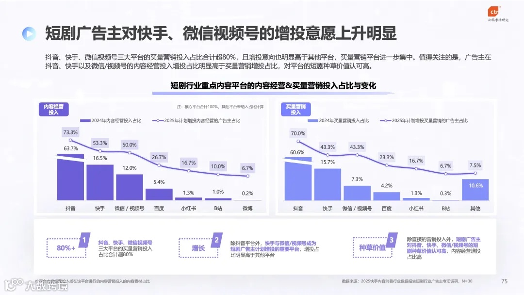 短剧广告主对快手、微信视频号的增投意愿上升明显