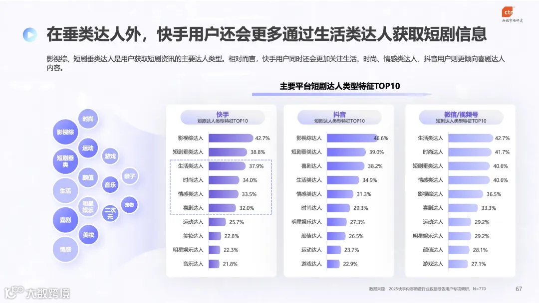 尽管影视综、短剧垂类达人仍是用户获取短剧资讯的主要来源,但在快手,生活、时尚、情感类达人同样成为重要的信息扩散节点。其他内容平台用户则更多通过喜剧类达人等接触相关信息,反映出平台间用户短剧达人关注结构的差异。