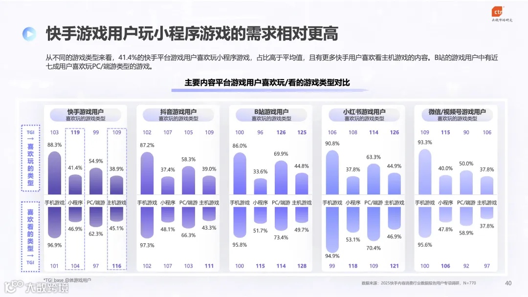 超四成快手游戏用户对小程序游戏表现出强烈偏好,比例高于整体均值。与此同时,对主机游戏相关内容同样拥有较高的观看需求,快手游戏用户既追求轻量化的互动体验,也不排斥深度观赏的游戏内容消费场景。