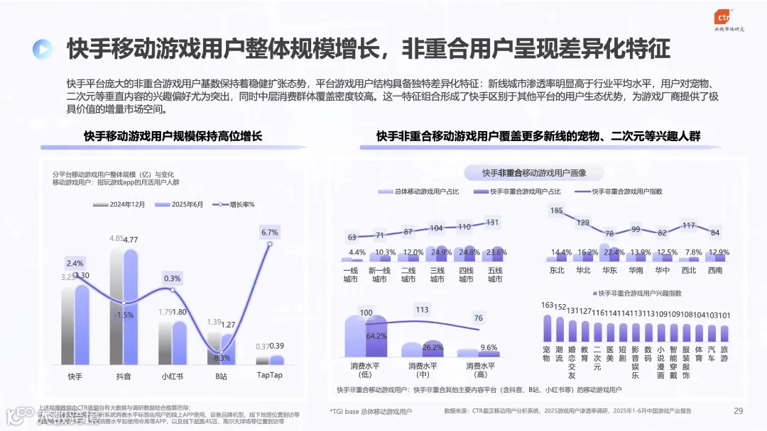 在游戏行业,快手移动游戏用户基本盘规模大且保持持续增长趋势。平台非重合用户更多来自新线城市(三线及以下城市),对萌宠、二次元等内容展现出浓厚兴趣,中层消费水平人群占比突出,展现出独特的非重合用户结构优势与增长潜力。