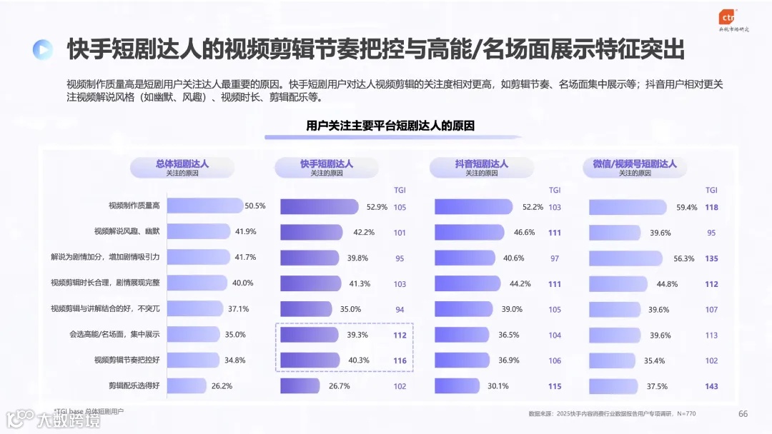 视频制作水平是影响短剧用户关注达人的首要因素。在快手,用户更看重剪辑的节奏感、高能片段的集中呈现等;而其他内容平台用户则相对更关注解说风格是否幽默、视频时长和背景音乐的使用。