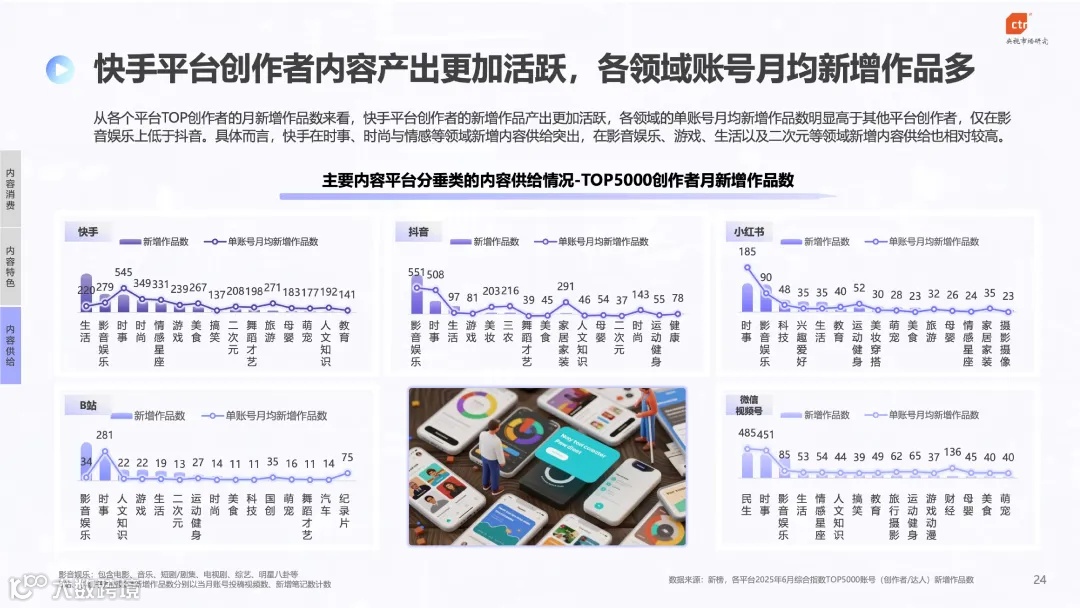 从内容生产端看,快手TOP创作者的月均作品发布数量领先行业平均水平。其在时事、时尚、情感、游戏、旅游、生活及二次元等领域持续保持强劲的内容产出能力,显示出极佳的创作者生态活力。