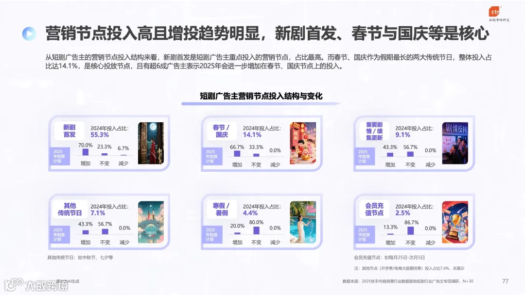 从短剧广告主的营销节点投入结构来看,新剧首发是短剧广告主最重视的营销节点,占比最高。而春节与国庆作为传统长假,也成为资源投入的重要节点,占整体投放比例同样较高,且超六成广告主计划在2025年加大在这些节点上的投入。