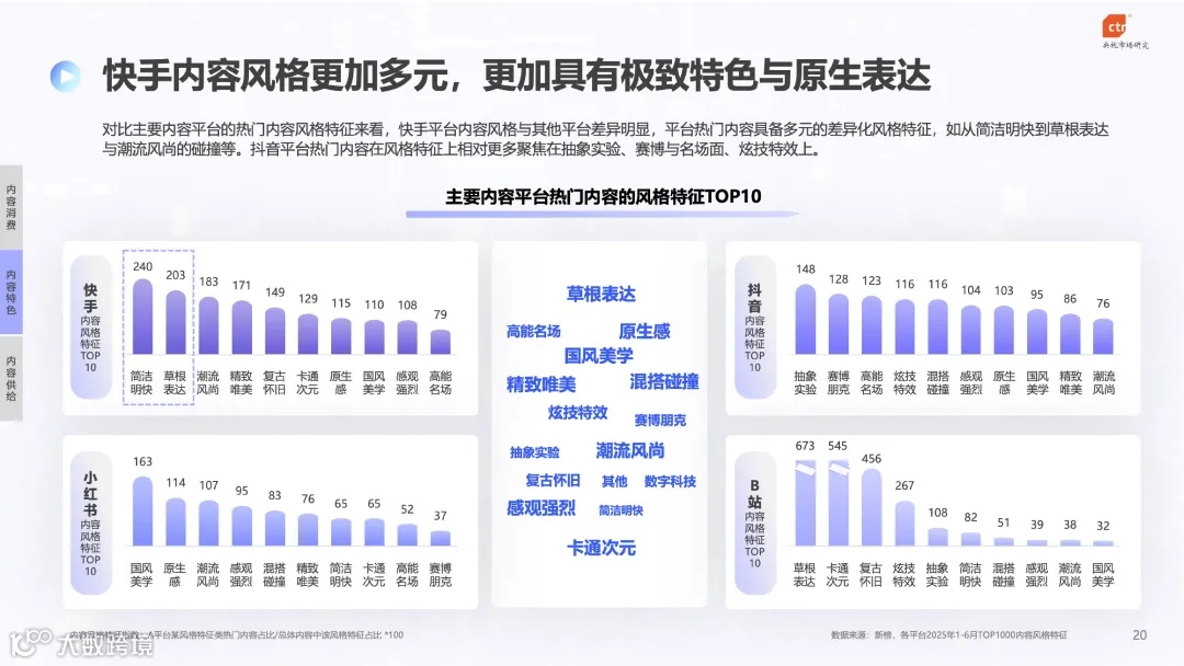 在平台内容风格层面,快手展现出鲜明的平台特质:既有简洁直接的草根气息,也不乏新潮时尚的视觉表达,多种风格碰撞融合,形成独特的内容张力。相比之下,其他主要内容平台则相对更聚焦于特效炫技、赛博元素与名场面的再创作,风格更侧重技术与形式创新。