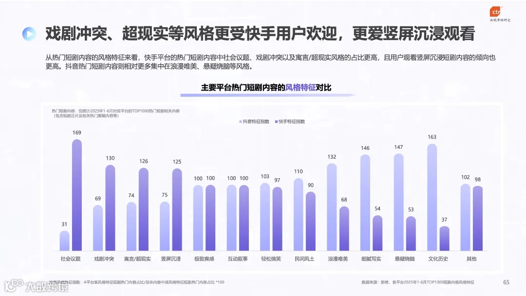 快手热门短剧更加侧重社会议题、强情节冲突和超现实叙事。同时,用户对竖屏沉浸观看模式接受度更高,推动短剧内容形态向移动原生体验不断靠拢。相比之下,其他主要内容平台短剧更偏重浪漫唯美与悬疑推理等风格。