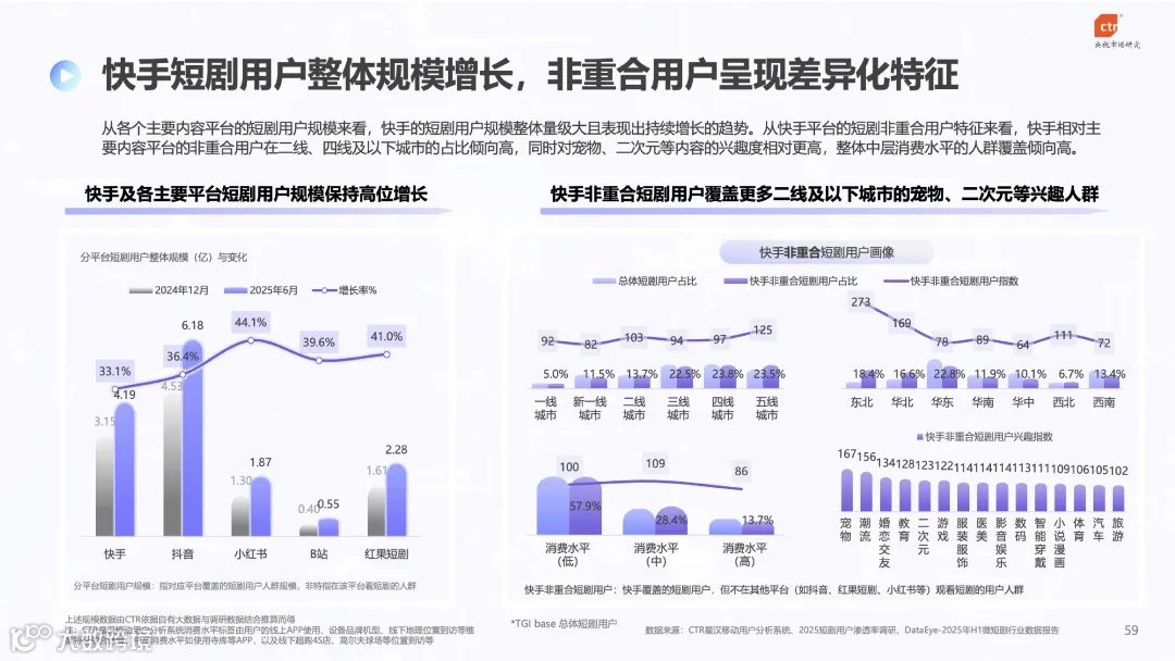 在短剧行业,快手短剧用户规模基数大,并保持增长态势。其中,非重合用户更多分布于二线、四线及以下城市,对宠物、二次元等内容有较高关注度,中层消费群体覆盖优势相对明显,展现出较强的市场渗透力和用户付费转化价值。
