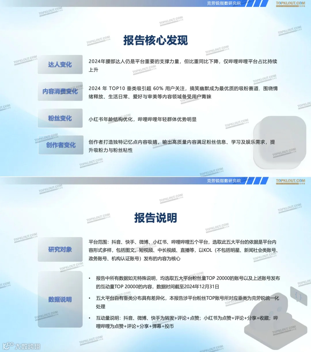 抖音、快手、微博、小红书、哔哩哔哩五个平台,选取其粉丝量TOP20000的账号及相应内容,数据截至2024年12月31日。 - 数据说明