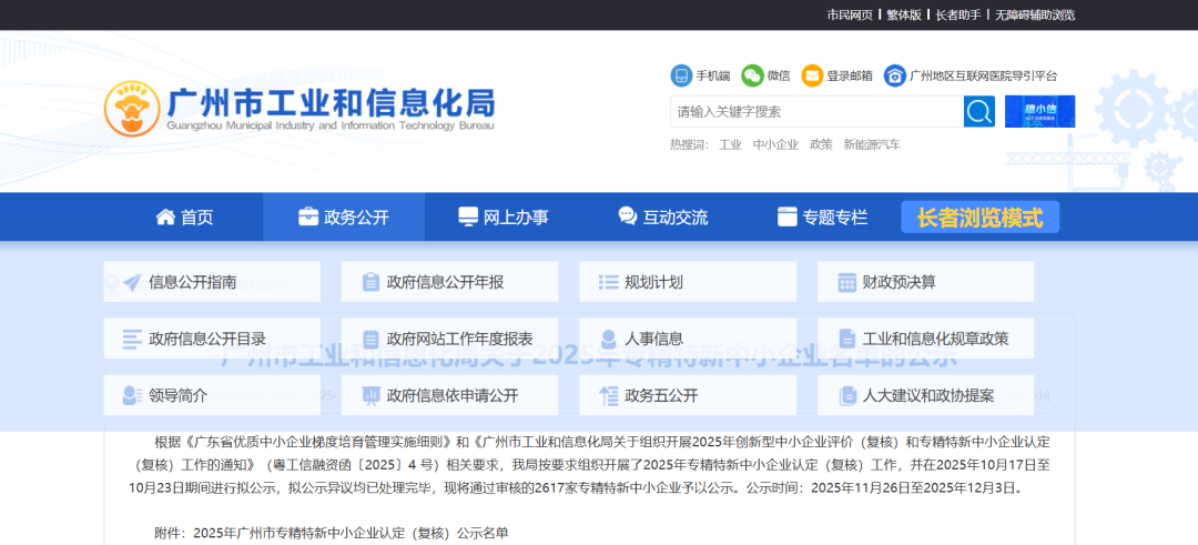 根据《广东省优质中小企业梯度培育管理实施细则》和《广州市工业和信息化局关于组织开展2025年创新型中小企业评价(复核)和专精特新中小企业认定(复核)工作的通知》(粤工信融资函〔2025〕4 号)相关要求,我局按要求组织开展了2025年专精特新中小企业认定(复核)工作,并在2025年10月17日至10月23日期间进行拟公示,拟公示异议均已处理完毕,现将通过审核的2617家专精特新中小企业予以公示。公示时间:2025年11月26日至2025年12月3日。