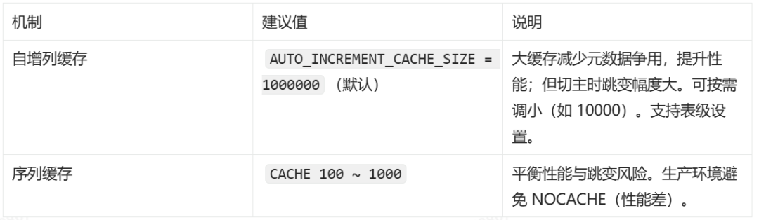 当前用户可以通过配置 AUTO_INCREMENT_CACHE_SIZE 来控制内存中自增列一次申请缓存的个数。CACHE SIZE 通常设置越大,性能会越好,但是如果跳变次数多,很可能快速导致自增列耗尽,从而开始报错主键冲突。