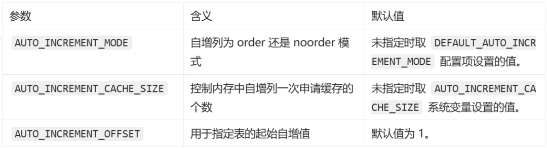 创建自增列时,默认为 ORDER 属性(为了和 MySQL 行为兼容)。