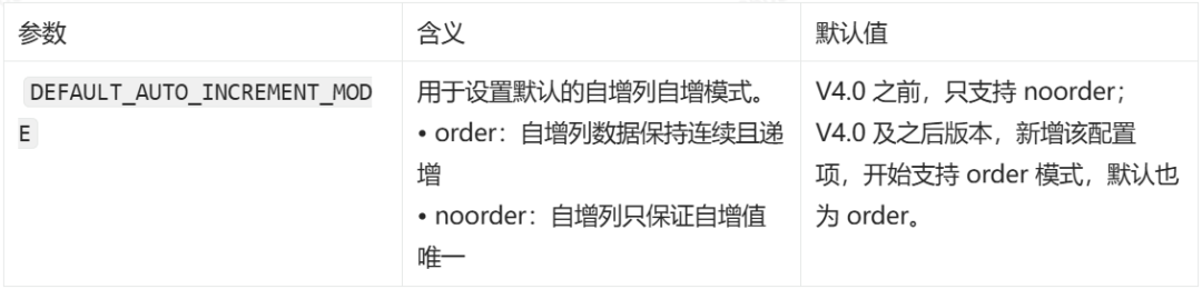 您可通过租户级配置项 DEFAULT_AUTO_INCREMENT_MODE 控制默认模式,也可在建表时指定 AUTO_INCREMENT_MODE。