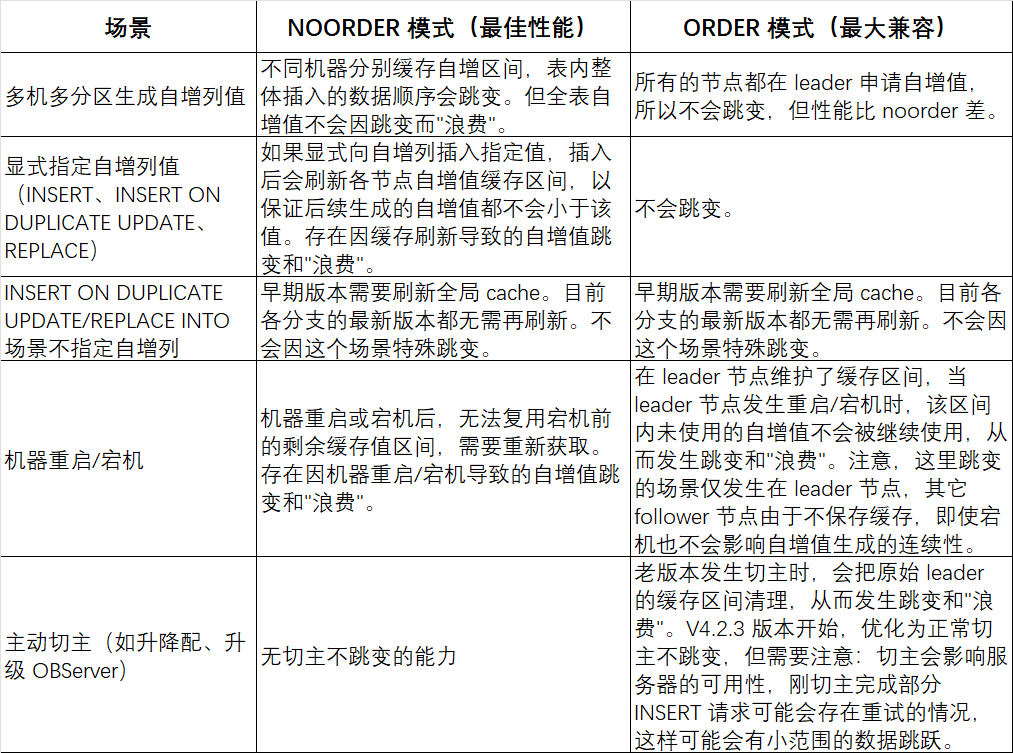 对于 ORDER 模式的自增列,虽然解决了多机多分区生成自增值和通过 INSERT 语句插入指定的最大值等场景下自增值跳变的问题,但是在作为 Leader 的 OBServer 节点的机器重启或宕机、发生切主的场景下,仍然会发生自增值的跳变。