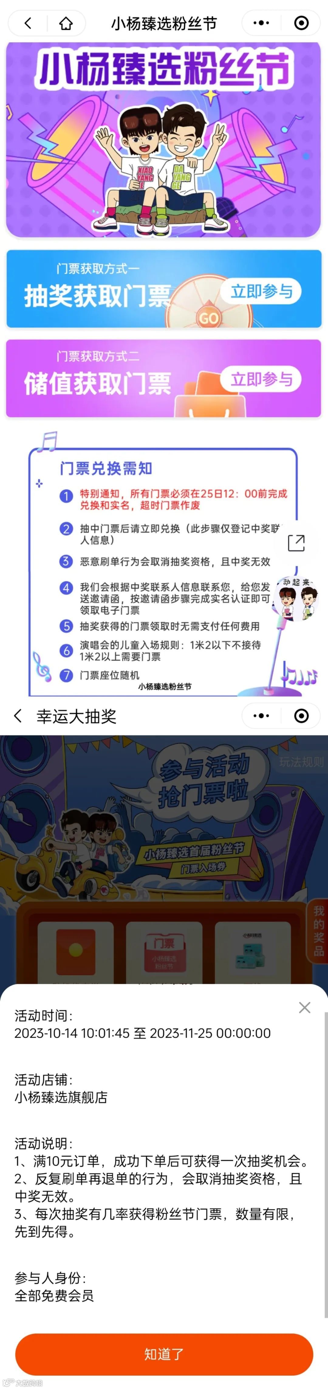 早在10月中旬,小杨哥团队就已开始为这场演唱会预热。而门票的主要获取方式有两种,一是在“疯狂小杨哥”“小杨臻选”等直播间抽奖,二是在“小杨臻选”的小程序抽奖或兑换。