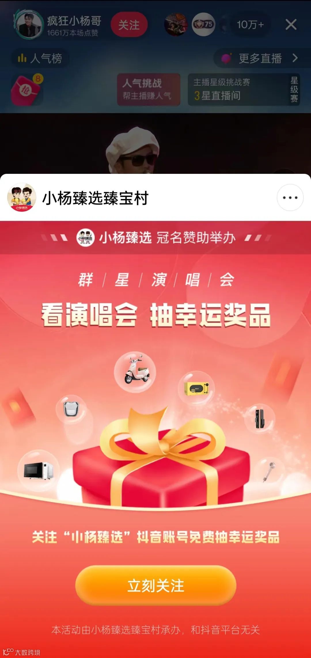 而且更重要的是,线上直播间里想要抽手机、剃须刀、床垫、冰箱、平板等奖品,也有一个“小小的”门槛——关注“小杨臻选”账号。