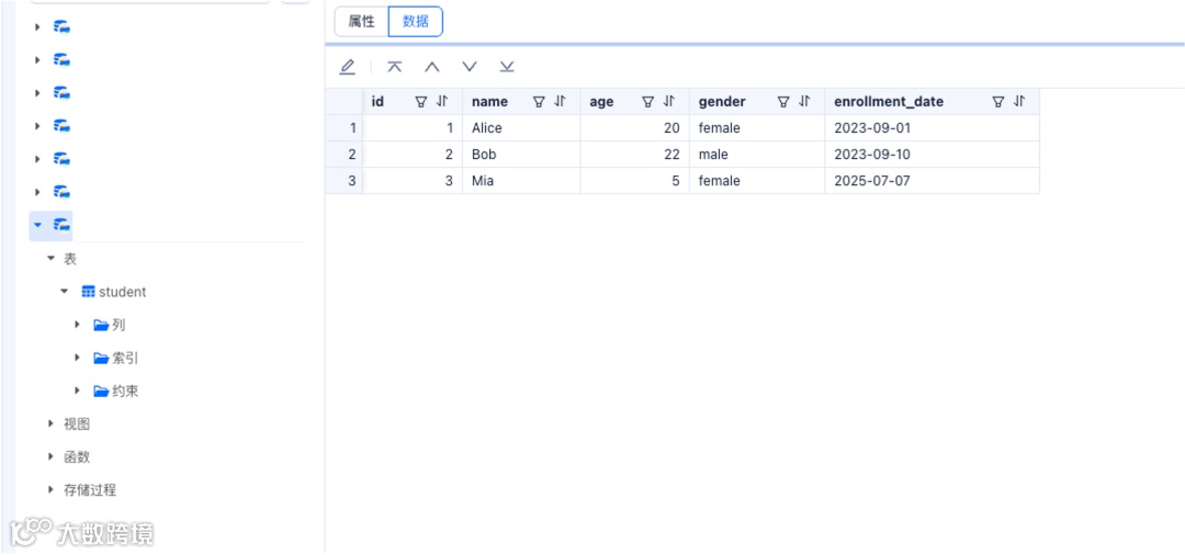4.执行如下语句,在实例 A 的数据库中创建 student 表格。