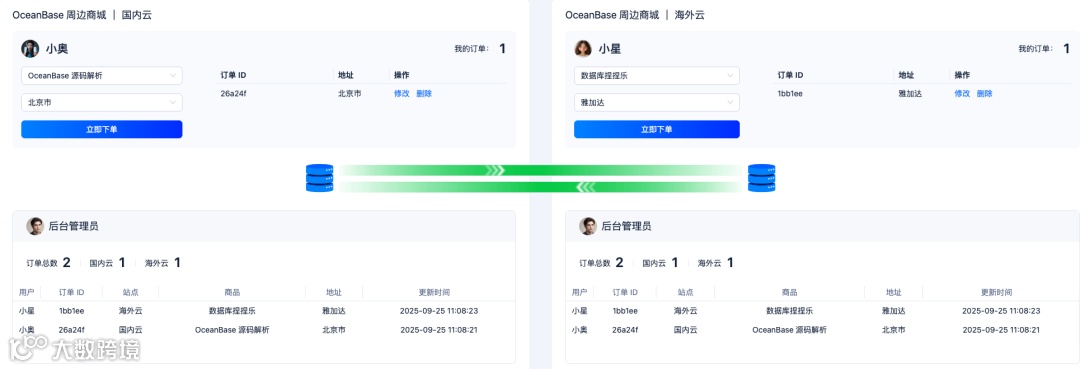 将商城业务部署在不同云厂商,客户分别在阿里云和腾讯云下单后,两端的数据库通过实时的跨云双活复制链路保持实时同步,详细内容参见 跨云双活高可用 Demo(可查看链接:https://www.oceanbase.com/demo/cross-cloud-bidirectional-synchronization)。本期最佳实践为您介绍在 OB Cloud 云数据库控制台如何实现跨云双活操作。