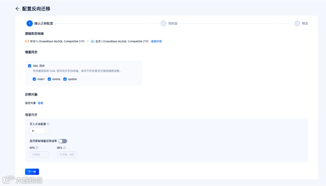 7.待正向任务处于 监控中 的增量同步阶段且任务状态为 运行中 时,单击反向任务后的 配置 按钮,确认源端和目标端信息,单击 下一步 配置反向任务。