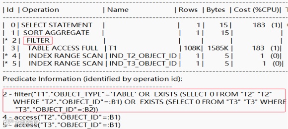 该SQL语句中存在两个exists关联子查询,且它们之间的关系为or,对该SQL语句的执行计划进行分析,其执行计划如下所示: