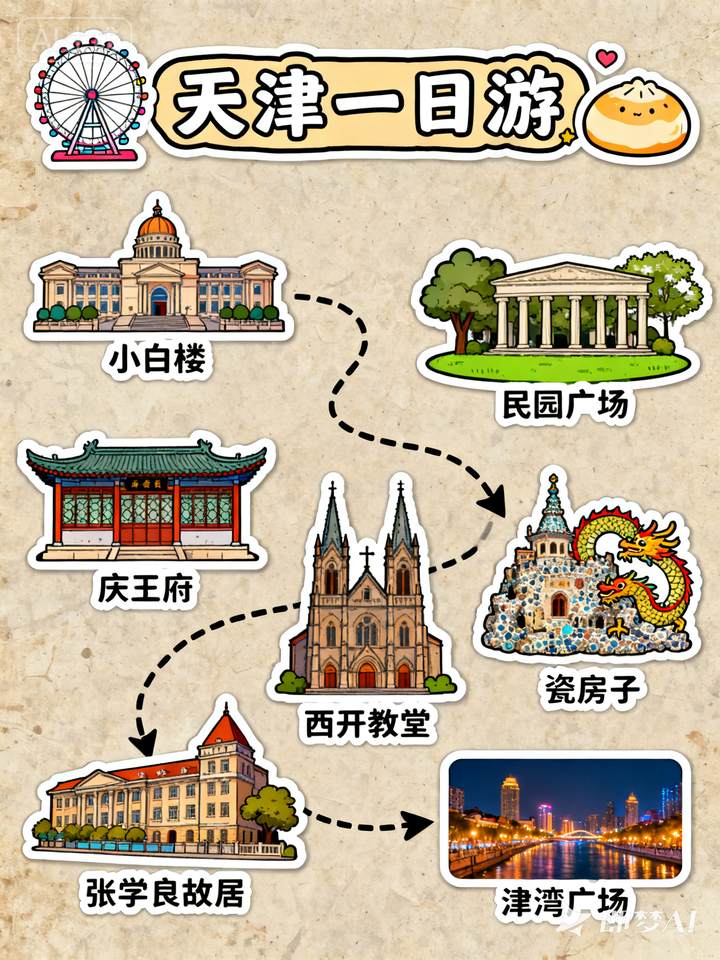 区域1 - 顶部标题区:在画面最上方居中,有一个独立的、横向的大尺寸【标题贴纸】。贴纸内部用可爱的卡通字体写着**“天津一日游”,并在这行文字的左右两边,点缀着一个Q版的【天津之眼摩天轮】和一个【狗不理包子】**作为装饰。