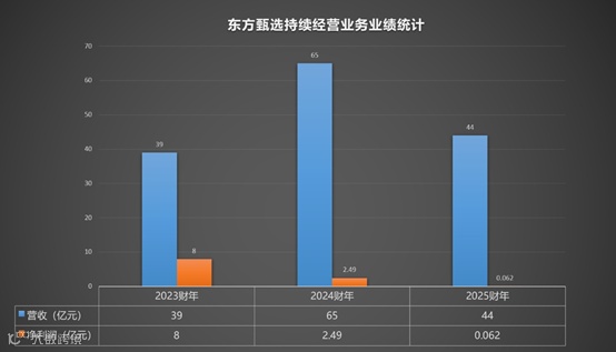 盈利表现方面,2025财年,东方甄选持续经营业务净利润为620万元,同比暴跌97.5%,不过环比中期业绩已实现扭亏为盈。若剔除出售与辉同行的财务影响,2025财年持续经营业务净利润为1.35亿元,同比增加30%。