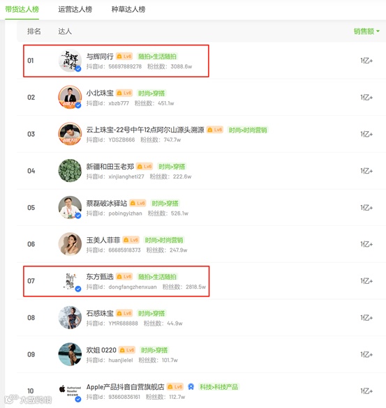 2025年7月抖音带货达人榜,数据来源:飞瓜