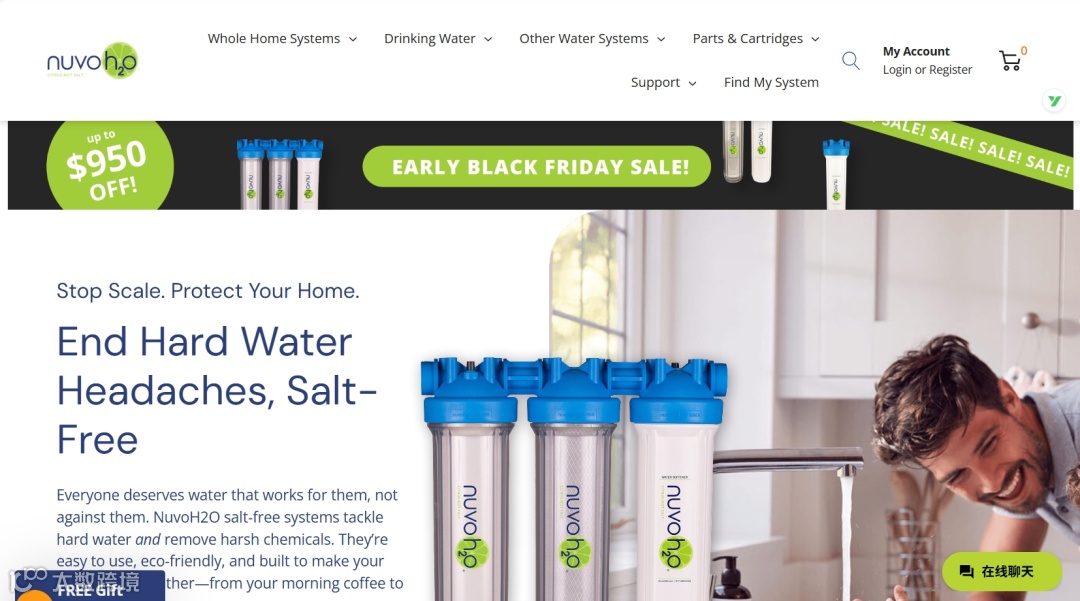 NuvoH2O 是一个专注解决家庭硬水问题的独立站品牌,以无盐软水技术和家庭水质改善方案为核心。其产品主要面向北美家庭用户,解决水垢、家电损耗、皮肤头发干燥、水味不佳等日常痛点。品牌定位围绕环保、低维护和适用于全屋用水场景展开,通过独立站直接销售软水器、过滤系统和定期更换滤芯服务,在居家生活改善领域建立相对明确的市场位置。